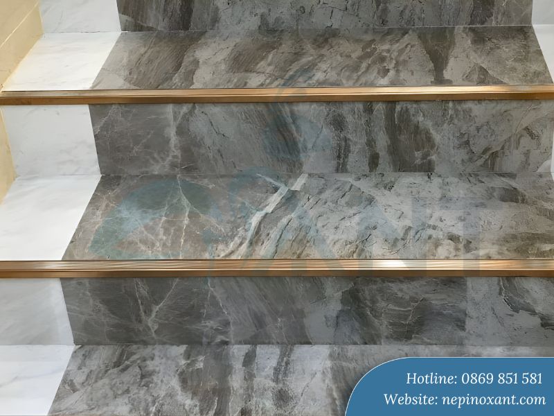 Nẹp bậc tam cấp bằng inox 304 là lựa chọn lý tưởng. Ánh kim loại sáng bóng tạo tương phản nổi bật trên nền đá tối màu. Nếu muốn tone màu ấm hơn, có thể chọn inox mạ vàng hoặc nẹp nhôm màu vàng. Điều quan trọng là đảm bảo bề dày nẹp phù hợp với độ dày tấm đá để tránh chênh lệch bề mặt.