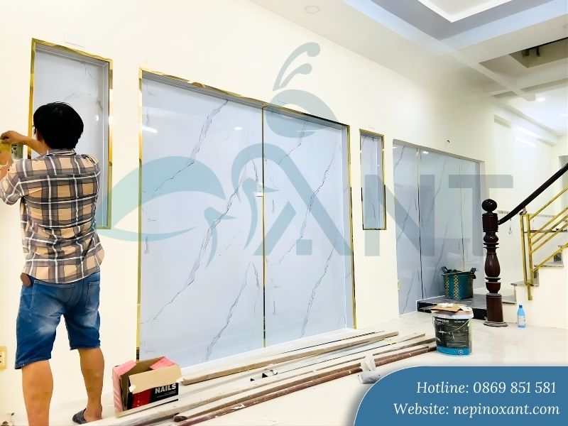 Lưu ý quan trọng: Không bóc lớp nilon bảo vệ cho đến khi hoàn tất toàn bộ công trình. Việc bóc sớm khiến bề mặt dễ bị trầy xước bởi các công đoạn thi công khác.