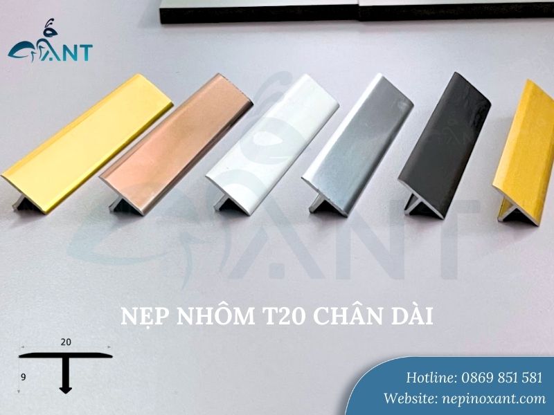 Nẹp nhôm T20 là loại nẹp trang trí chữ T rộng 20mm được ưa chuộng trong xây dựng và nội thất. Sản phẩm được chế tạo từ hợp kim nhôm 6063 theo công nghệ đùn ép khuôn. Bề mặt được xử lý mạ Anode giúp tăng độ bền màu vượt trội. Điều này đảm bảo tuổi thọ lâu dài cho công trình của bạn.