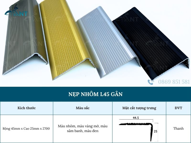 Thông số kỹ thuật nẹp nhôm L45 gân