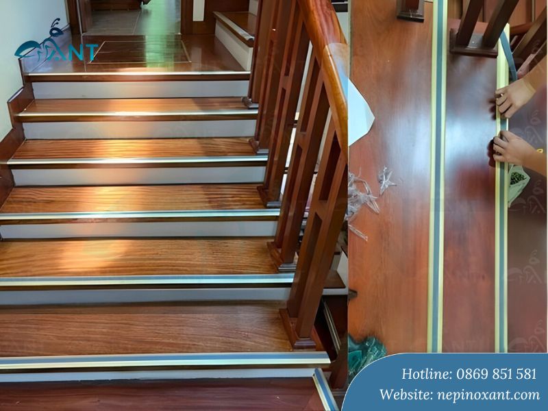 Lắp dây cao su vào rãnh nẹp tạo độ chống trơn. Kiểm tra độ chắc chắn bằng cách dùng tay ấn thử. Lau sạch keo thừa tràn ra xung quanh.
