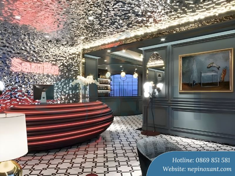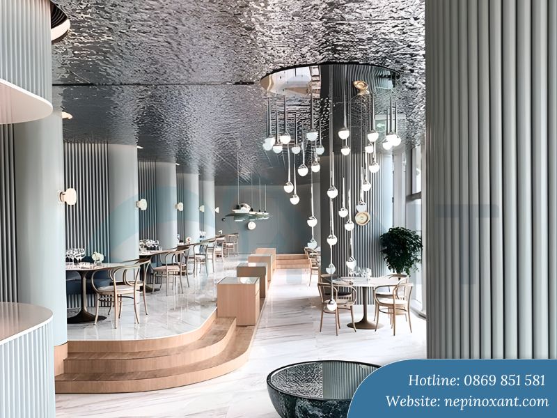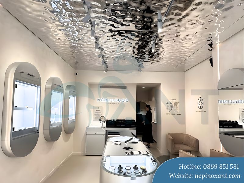 Một điểm cần lưu ý là chiều cao tối thiểu để thi công trần inox sóng nước nên từ 2.8 mét trở lên. Với chiều cao thấp hơn, hiệu ứng phản chiếu có thể gây cảm giác chói mắt hoặc bí bách cho người sử dụng.